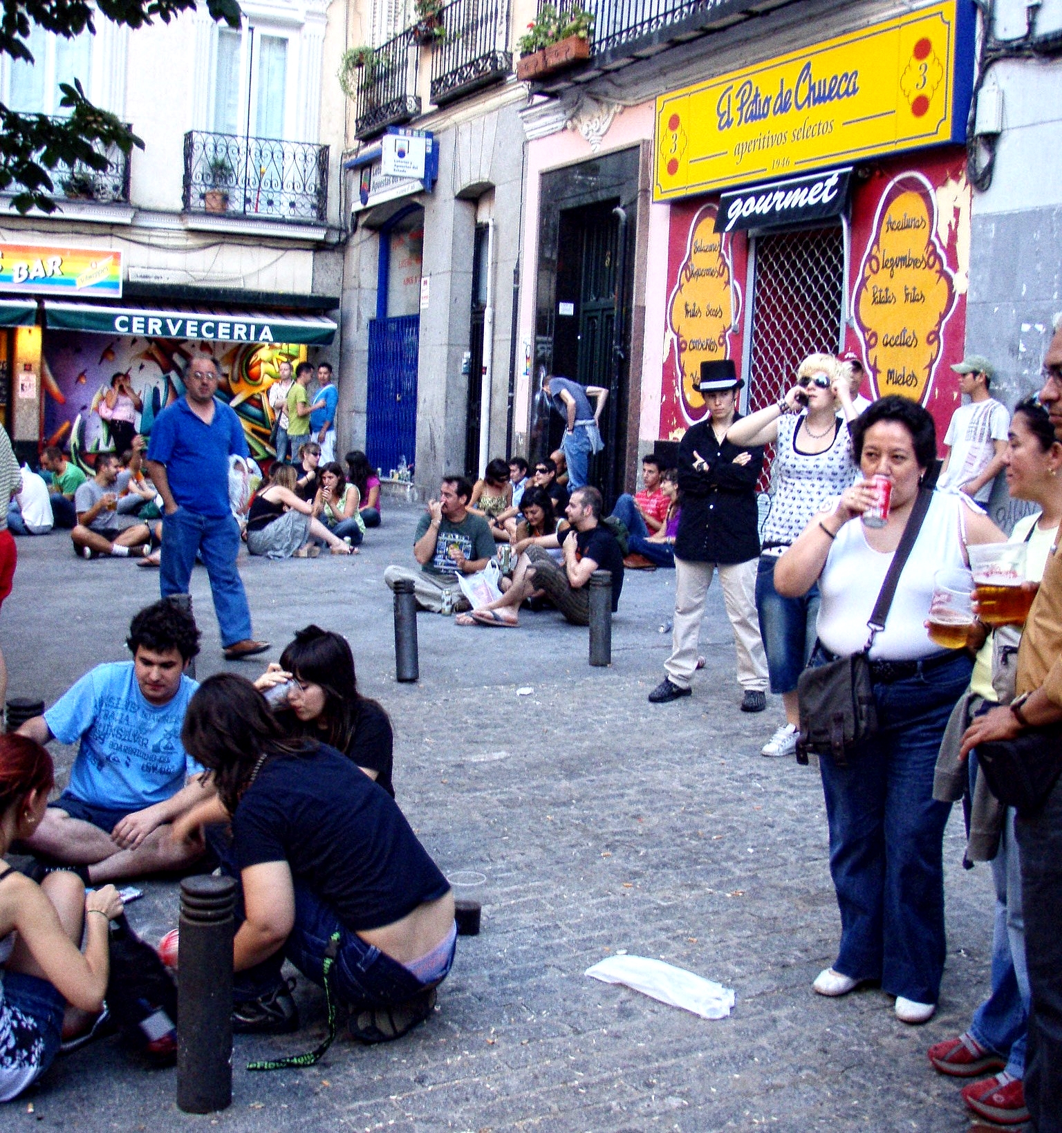 parasti notiek bāros un tur arī bieži vien tiek patērēts alkohols arīdzan galvenokārt sociāla kontakta pastiprināšanai. Turpinot vēlos pastāstīt par dzeršanu un iedzeršanu nedēļas nogalēs, kas arī atšķiras no Lavijā pieņemtā. Šeit atkal vēlos stāstīt tieši par Madridi un manis piedzīvot šeit. Ko esmu novērojusi, tad madridiešiem ir tāda kā tradīcija, ko viņi piekopj dodoties ārā “ielās” nedēļas nogalēs un ne tikai - kas ir rotācijas pa bāriem. Tas notiek tā, viss sākas jau ap 20:00 vai 21:00 ar vakariņām. Kad vakariņas ir paēstas tad var sākt doties bāru tūrē, kas parasti ir 3-4 bāri un viens vai divi klubi. Nevis tā kā Latvijā apsēdies vienos koijotos un sēdi līdz rītam. Šeit cilvēkiem patīk pārvietoties un līdz ar to laiks vienā bārā ir no 20 minūtēm līdz vienai stundai, tas galvenokārt atkarīgs no cilvēku skaita. Vēl pastāstīšu par vēl vienu interesantu parādību, kas novērota Spānijā - botellon. Tas ir kad, liels daudzums cilvēku parētē alkoholiskās dziras atrodoties uz ielas. Teorētiski, tas nav atļauts un ir iespēja, ka policija var to apturēt, taču bieži esmu novērojusi botellon Madridē, kur policijas nav ne tuvumā. Tas parasti notiek, kad sapulcējas vairāk nekā 30 cilvēki, pārsvarā jaunieši. Pārsvarā tas notiek pēc lieliem pilsētas pasākumiem vai Madridē universitāšu apkaimē. Pievienoju arī ilustratīvu attēlu, lai vieglāk saprast par ko tieši runāju.